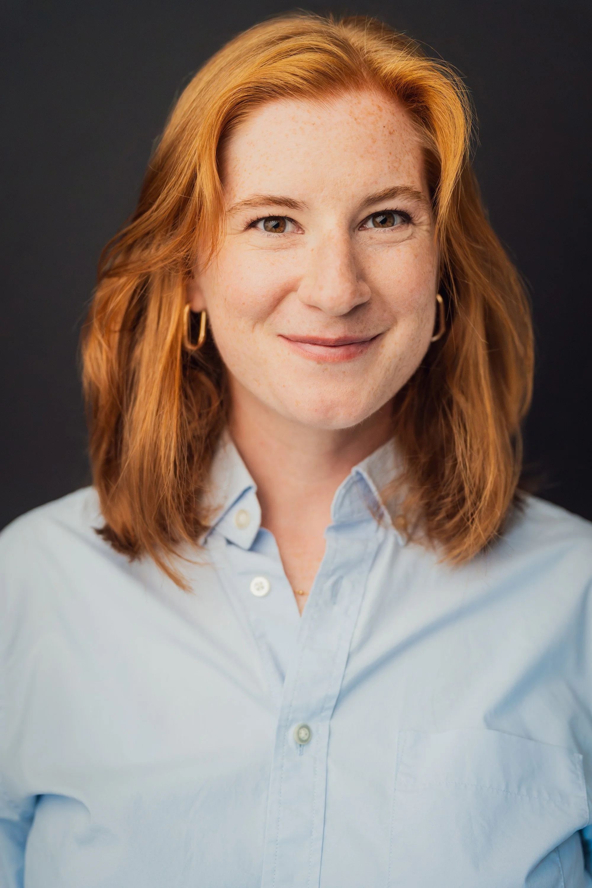 A woman with red hair, light skin, wearing a light blue button-up shirt, gold hoop earrings, smiling, against a dark background.